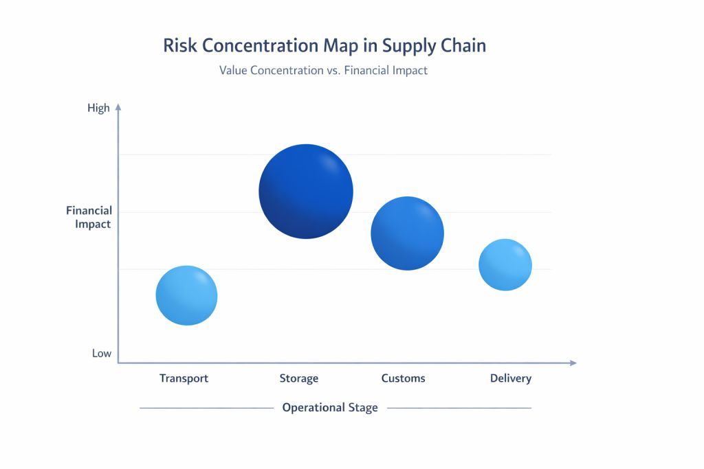 One of the most underestimated issues in logistics is concentration risk. Many companies perceive logistics exposure as dispersed because cargo is constantly moving. In practice, however, cargo often accumulates at specific nodes: consolidation warehouses, cross-docking points, customs terminals, inland depots, bonded storage facilities, and transshipment locations. These nodes create temporary but significant value concentration.