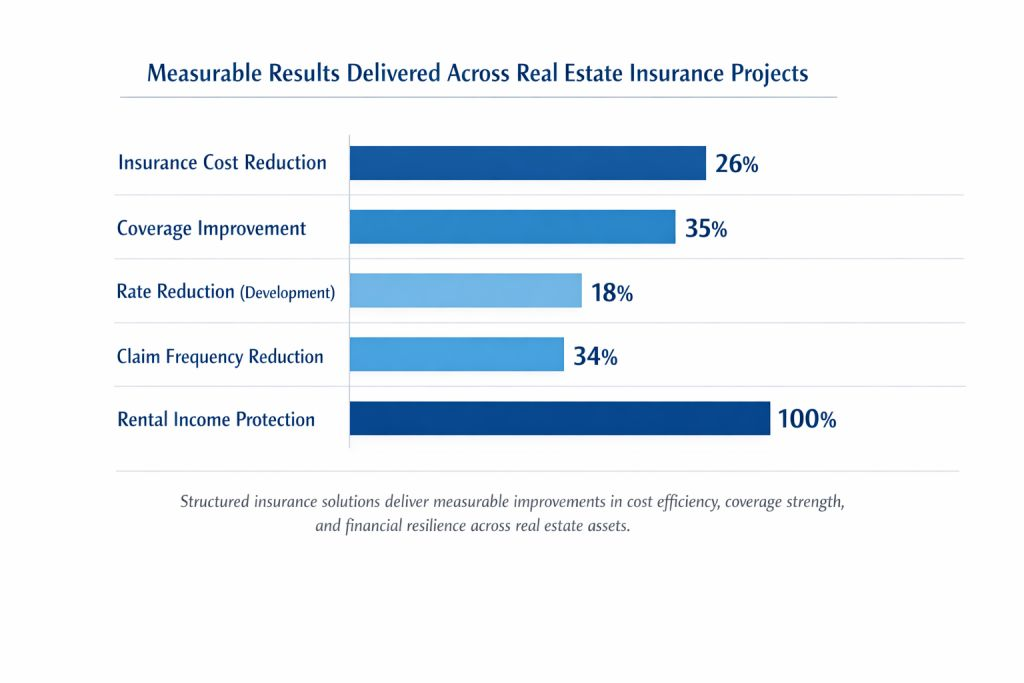 Real estate assets require structured insurance solutions that go beyond standard coverage. Practical implementation of risk management strategies demonstrates measurable financial impact, including cost optimization, improved protection levels, and enhanced investment stability. Below are selected real estate cases illustrating how tailored insurance programs deliver tangible business results.